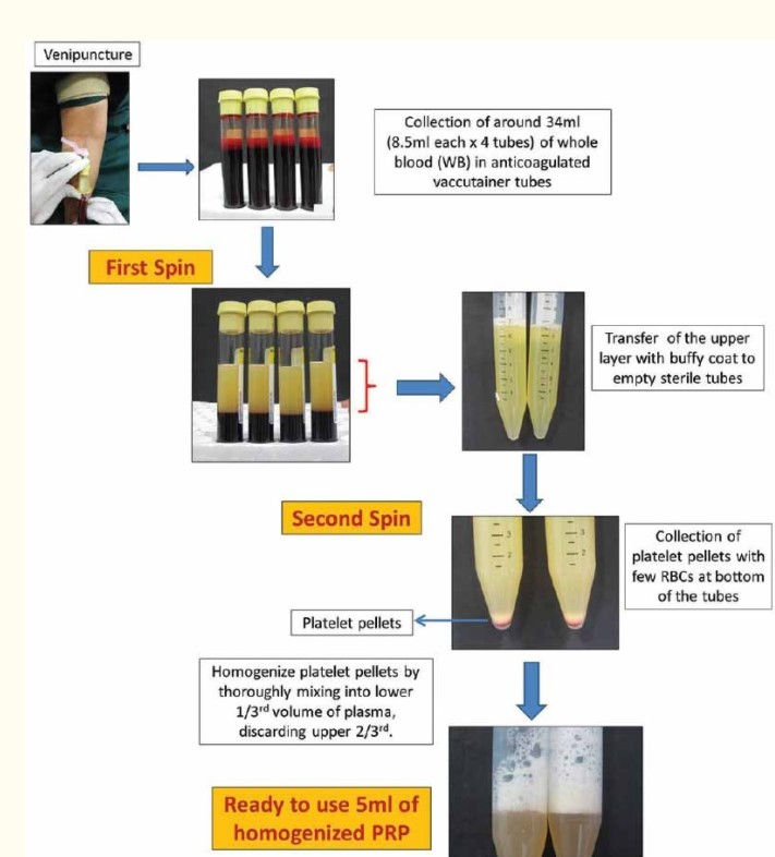Αυτή η διαδικασία (θεραπεία) μπορεί να πραγματοποιηθεί στο ορθοπαιδικό ιατρείο με αιμοληψία από περιφερική φλέβα. Διαρκεί περίπου 15- 30 λεπτά και δεν πρέπει να λαμβάνονται αντιφλεγμονώδη φάρμακα μια βδομάδα πριν και μια βδομάδα μετά τη διαδικασία. Επειδή δημιουργείται από το ίδιο το αίμα του ασθενή δεν δημιουργεί αλλεργικές αντιδράσεις ή επιπλοκές.